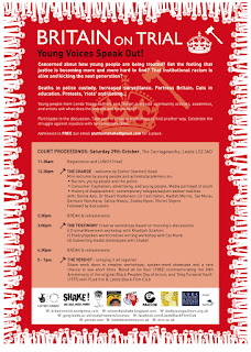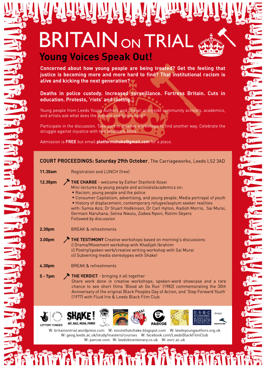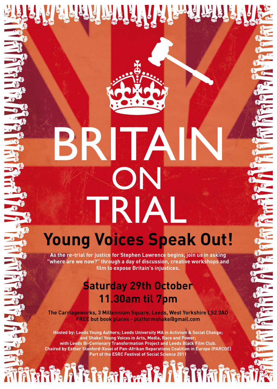Anyone wanting to listen to young people and discuss with us how to take a stand and foster creative resistance to institutional racism – you should come to this. The re-trial for justice for Stephen Lawrence is beginning in November. The country is trying to pretend the ‘riots’ never happened. In Britain on Trial, we ask “where are we now” through a day of workshops and an evening performance to expose Britain’s injustices.
