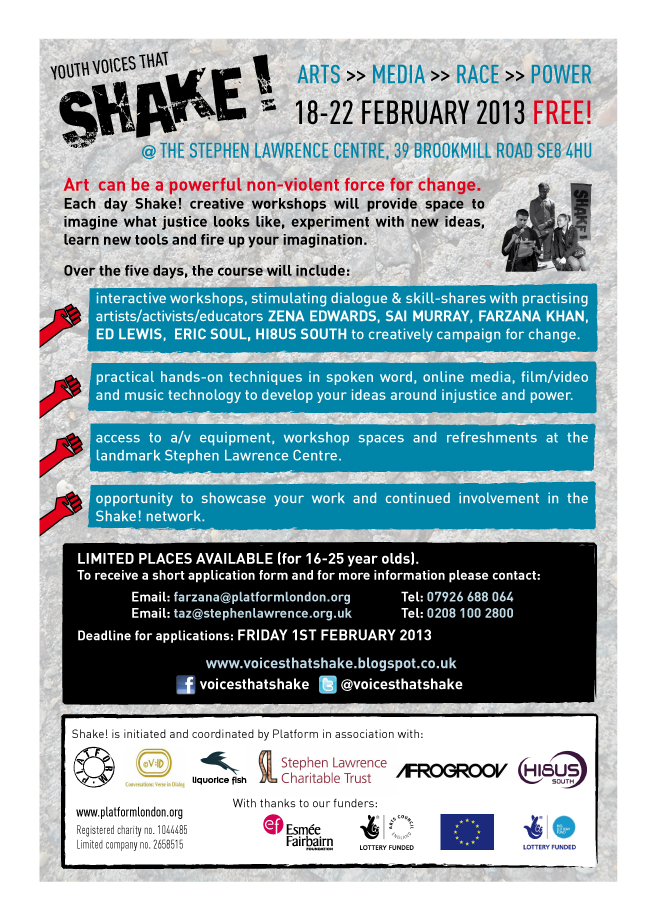 Shake! is initiated and coordinated by Platform in association with: Conversations Verse in Dialog // Liquorice Fish // Stephen Lawrence Charitable Trust // Afrogroov