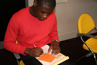 Sai then shared his experience of working with the Leeds Young authors and how he created a group piece based on the theme “I come from.”  Then it was our turn to try and do the same, by picking out the strongest lines in our poems and writing them down on massive paper to see how we could create a flowing story that was about where we came from.  Our poems touched on themes from our ancestry, identity, where we reside and using our own mother tongue to create one story.