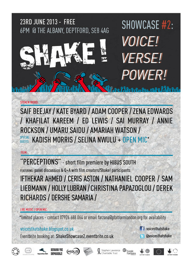 Voice! Verse! & Power! is the explosive showcase from the participants of the second Shake! course. Featuring freshly created poetic, filmic and musical responses to injustice, the showcase will present an original and inspiring mix of political creativity. The event is FREE, but with limited capacity, it is important to get your tickets early! So get on down to The Albany in Deptford on June 23rd and join us for what promises to be an electric event.